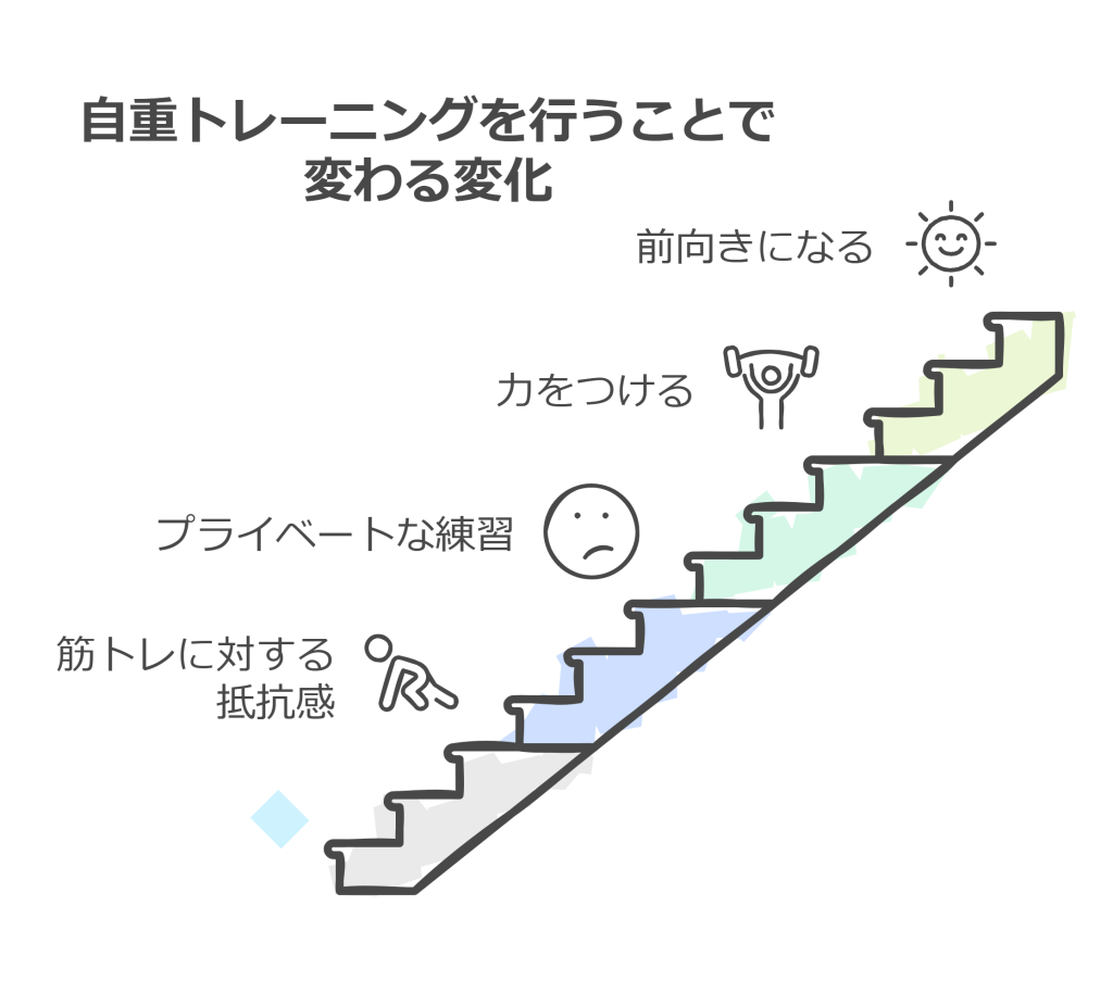 たとえば、「初めは膝つき腕立て伏せしかできなかったけれど、数週間後には普通の腕立て伏せができるようになった」という小さな成功が自信につながります。