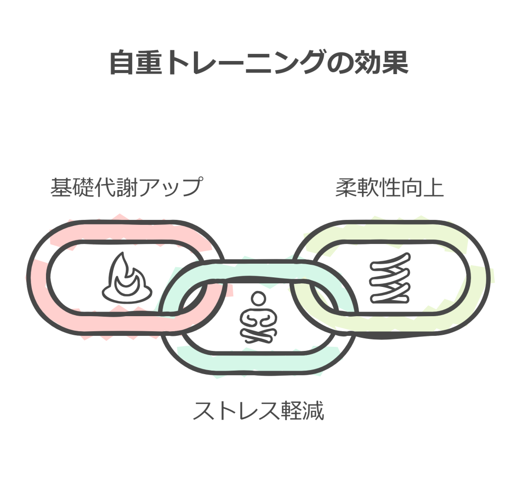 • 柔軟性向上:自重トレーニングは関節の可動域を広げるため、日常生活での動きがスムーズになります。